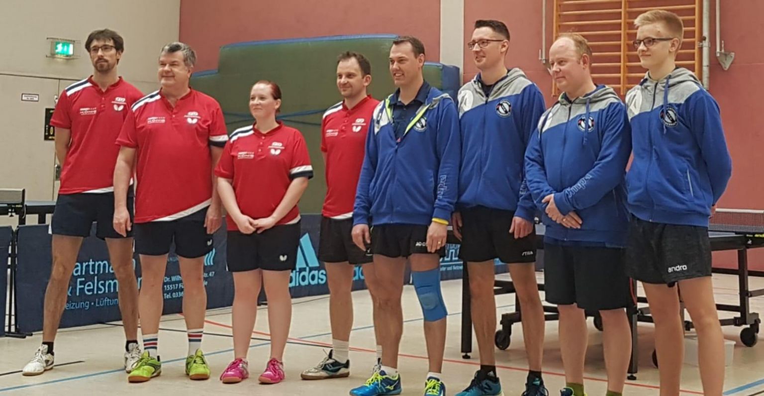 Wie die Hauptüberschrift des Artikels schon zeigt, trafen der bisherige Tabellenführer Fürstenwalde II auf den Zweiten Rotation Leegebruch. Es sollte nicht nur dem Namen nach ein echtes Spitzenspiel werden. In einer sehr ausgeglichenen Partie hat am Ende die etwas glücklichere Mannschaft aus Leegebruch einen knappen 8:6 Auswärtssieg aus Fürstenwalde mit nach Hause genommen. Dazu gehörte auch das Glück, einige Ballwechsel mit Netz- und Kantenbälle für Leegebruch zu beenden, so dass dieser äußerst knappe Auswärtssieg gesichert werden konnte. Mit dem Sieg über Pneumant Fürstenwalde II führt nunmehr der TTC Rotation Leegebruch I die Tabelle der Landesliga an. Es war einer sehr starke Mannschaftsleistung aller Beteiligten. Unsere Nummer 1, Matti Bachmann und unsere Nummer 2, Reiner Mehr haben ihr Doppel gewonnen und konnten weiterhin jeweils 2 Einzelsiege verbuchen. Unsere Nummer 3, Marco Brudek gewann 1 Einzel. Eine sehr starke Leistung zeigte Martin Matzdorf als Ersatzmann aus der 2. Mannschaft, der ebenfalls 2 Einzel gewinnen konnte. Darunter war sogar ein Einzelsieg über die Nummer 2 unserer Gastgeber aus Fürstenwalde.